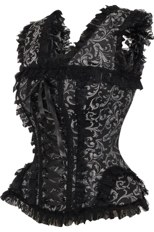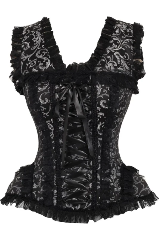Silver/Black Swirl Brocade & Lace Steel Boned Gothic Corset w/Cap Sleeves