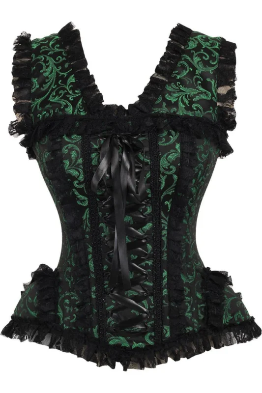 Green/Black Swirl Brocade & Lace Steel Boned Gothic Corset w/Cap Sleeves
