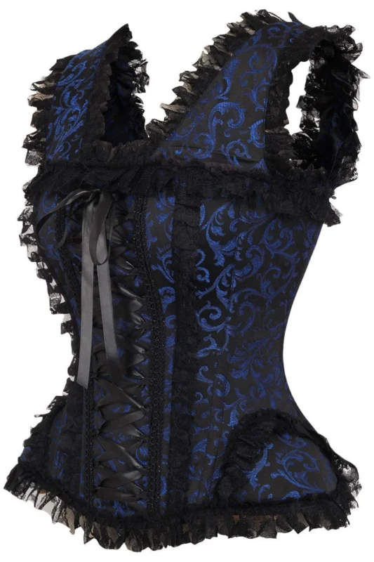 Blue/Black Swirl Brocade & Lace Steel Boned Gothic Corset w/Cap Sleeves