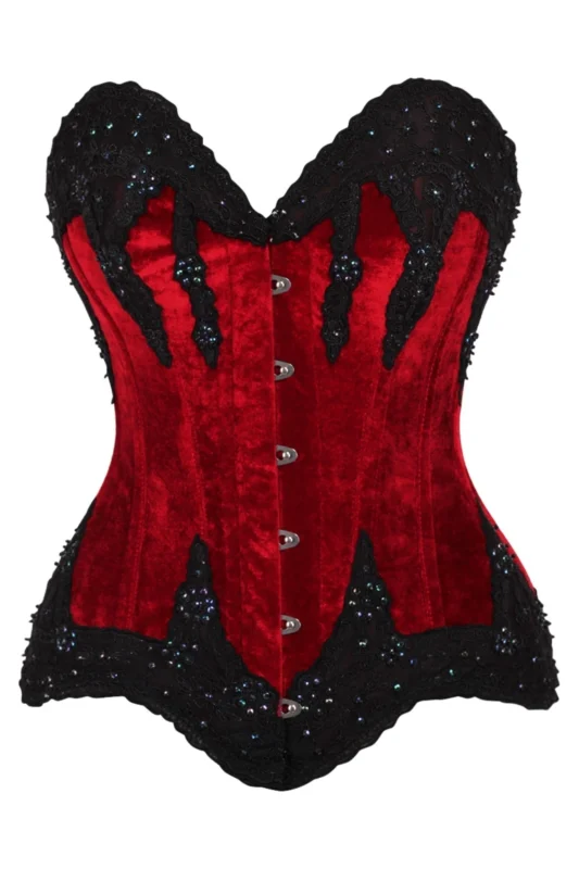 Gothic Dark Red Velvet & Beaded Steel Boned Overbust Corset Bustier Top