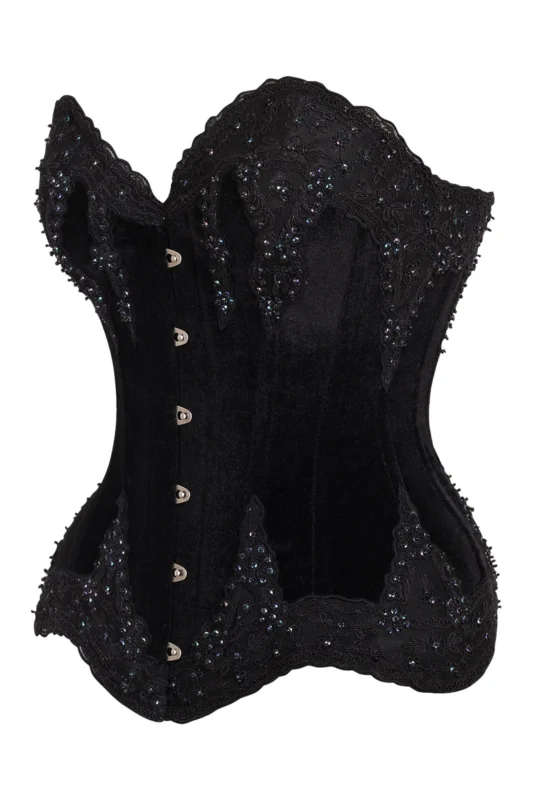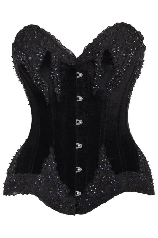 Gothic Black Velvet & Beaded Steel Boned Overbust Halloween Corset