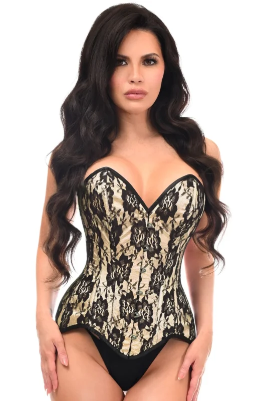 Sexy Nude Satin w/Black Lace Overlay Steel Boned Strapless Gothic Corset Top
