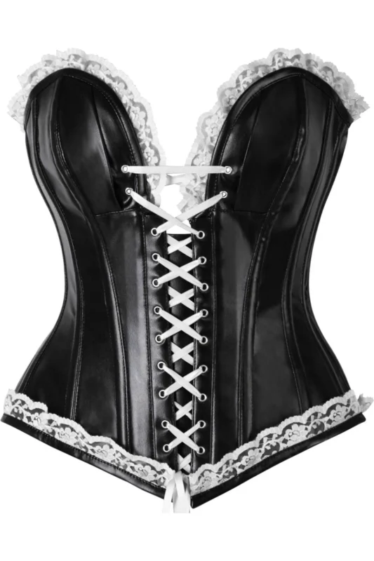Black Faux Leather & Black Lace Trim Lace-Up Steel Boned Gothic Corset