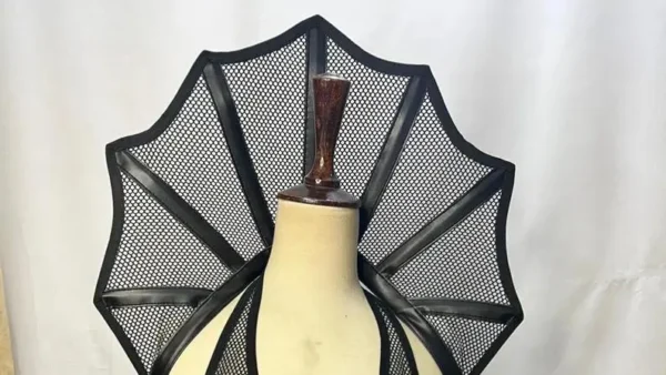 Gothic Black Lace Corset Dress with Sheer High-Slit Skirt & Dramatic Mesh Fan Collor – Dark Fairy, Vampire, Witch, Halloween Costume
