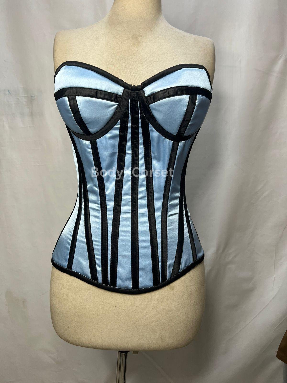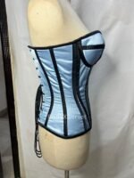 Made from premium-quality satin in a soft baby blue hue, this overbust corset features bold black vertical boning channels that create a flattering silhouette and give a striking contrast. The strapless sweetheart neckline adds a romantic touch while highlighting your natural shape, making it ideal for pairing with skirts, pants, or worn as a standalone bustier top.