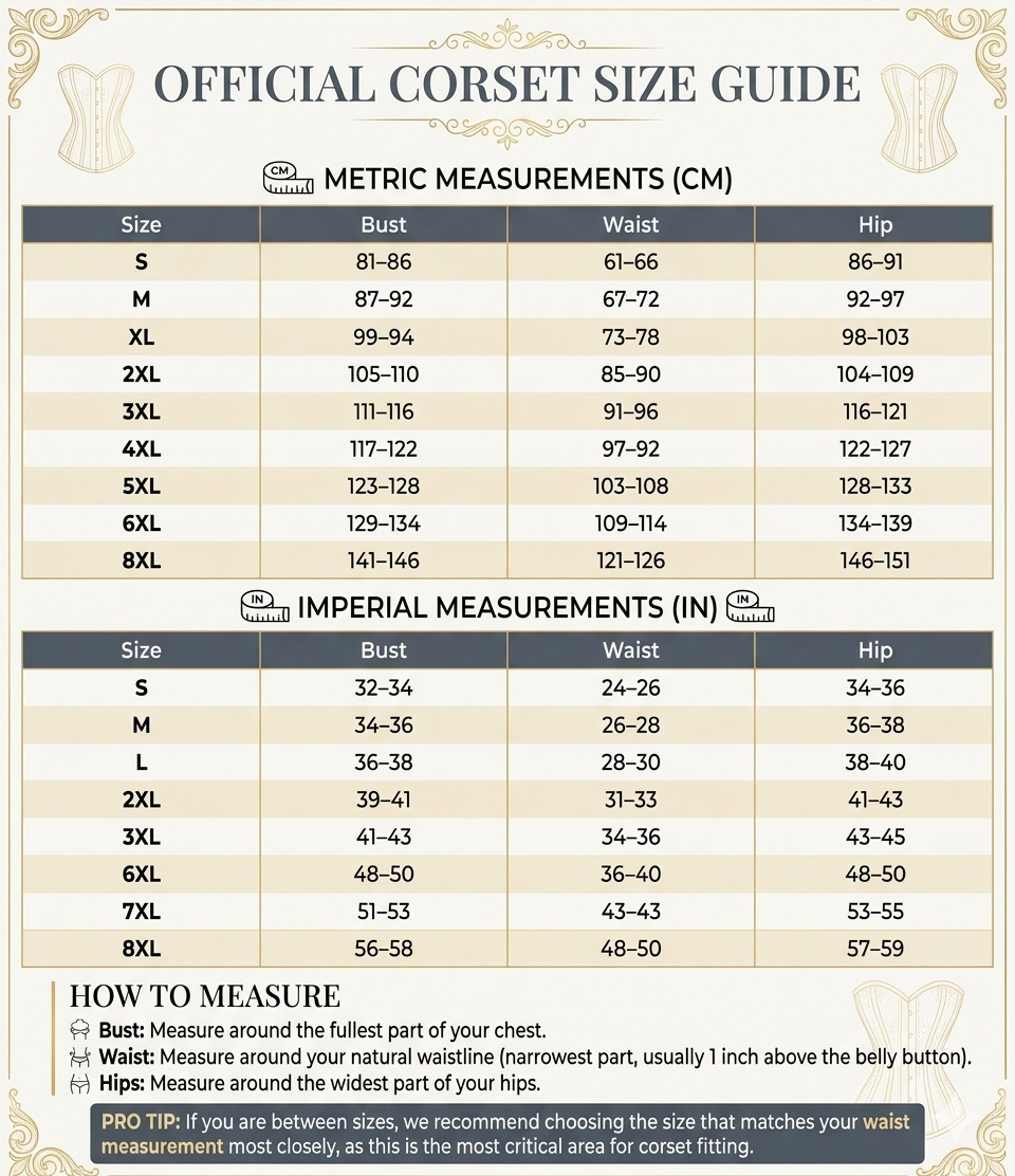 If you are between sizes, choose the larger size for comfort. The corset allows waist reduction of approximately 5–10 cm depending on lacing.