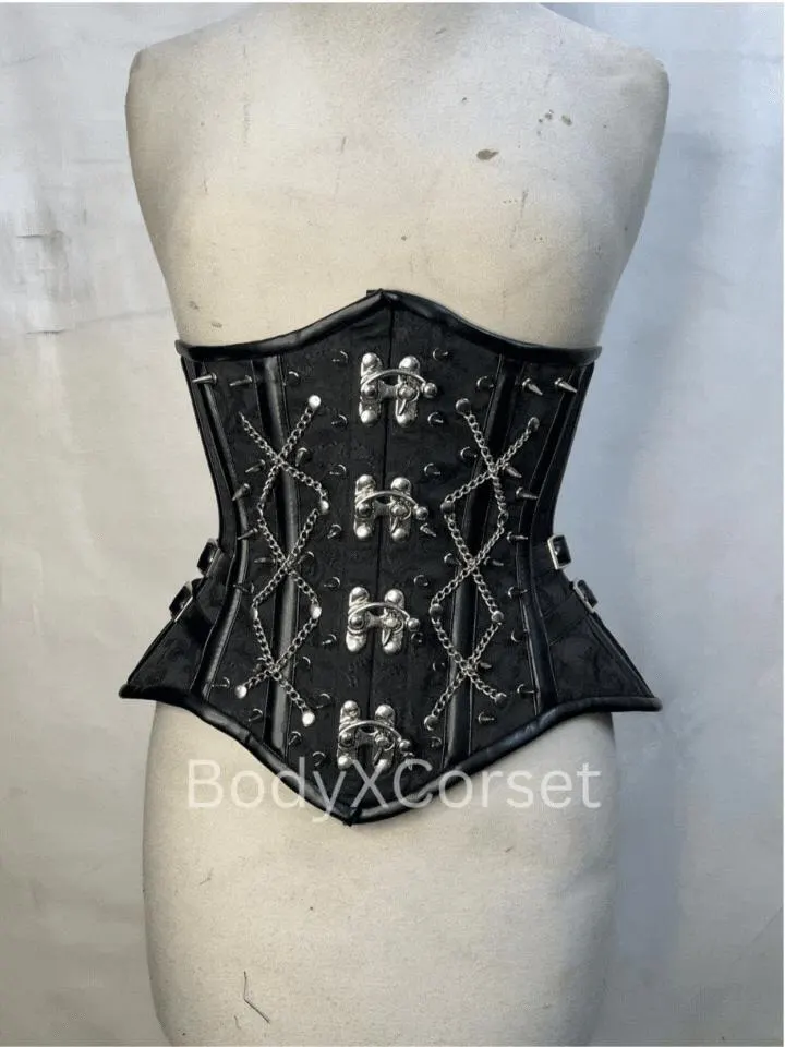 Silver chain detailing at the front introduces a bold gothic and punk-inspired aesthetic, making this corset stand out as both a functional shaping garment and a statement fashion piece.
