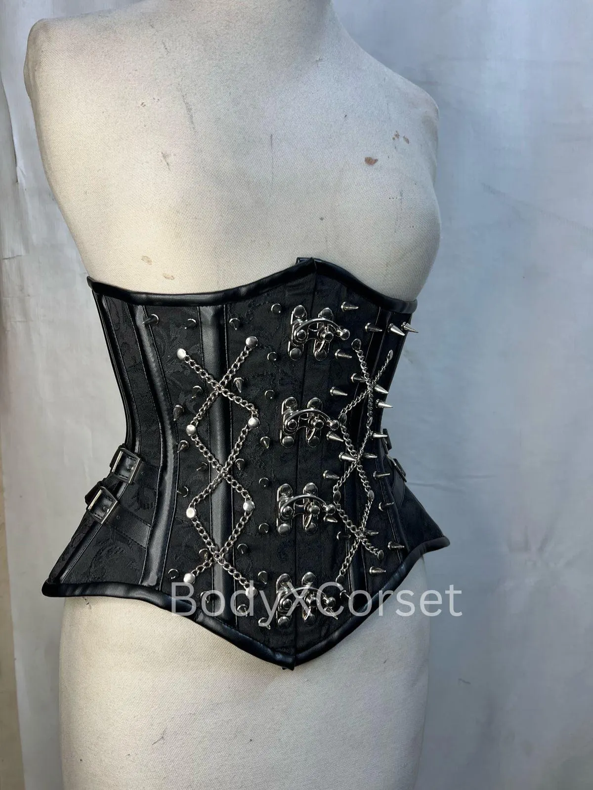 - Front closure: Heavy-duty metal clasp busk