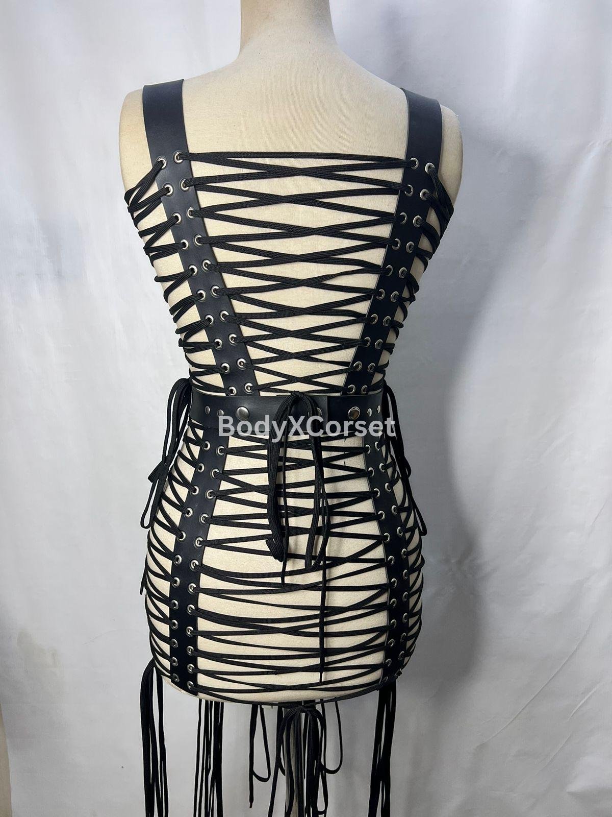 Elevate your alternative fashion game with this Black Leather Lace-Up Cage Dress Harness, a daring fusion of gothic elegance and fetish-inspired design. Handmade with attention to detail, this edgy body corset combines high-quality faux leather and durable elastic laces, making it the perfect statement piece for a wide range of occasions—from festival wear to club outfits, cosplay, BDSM fashion, and more.