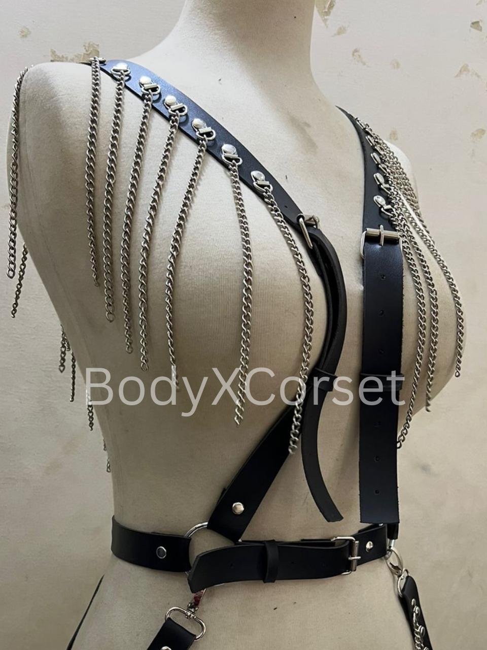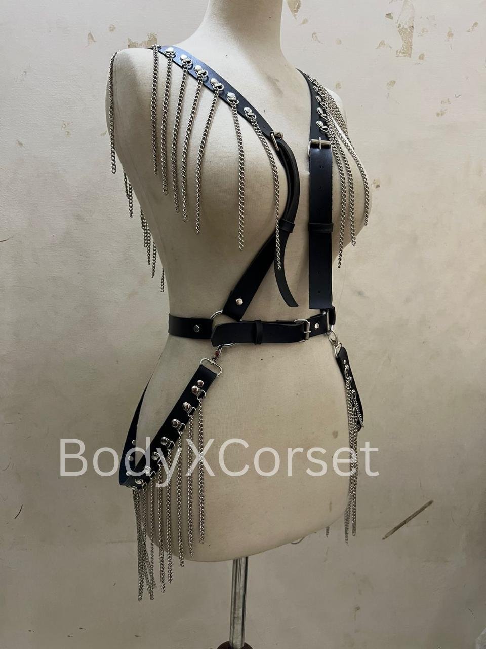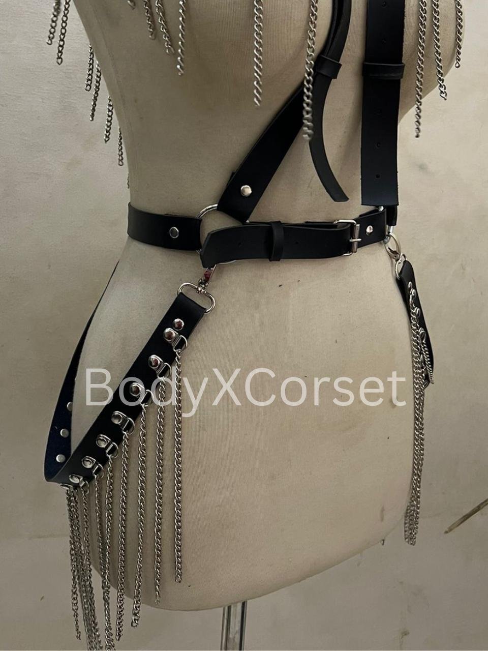Crafted from faux leather belts and sleek silver chains, this harness-style bralette wraps around your chest and shoulders in a structured, high-impact design. The leather-look straps give off a bold, biker-inspired vibe while the glinting chains add that perfect touch of drama. It’s fully adjustable, so you can find your fit and rock it your way—tight and lifted, or loose and layered.