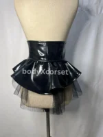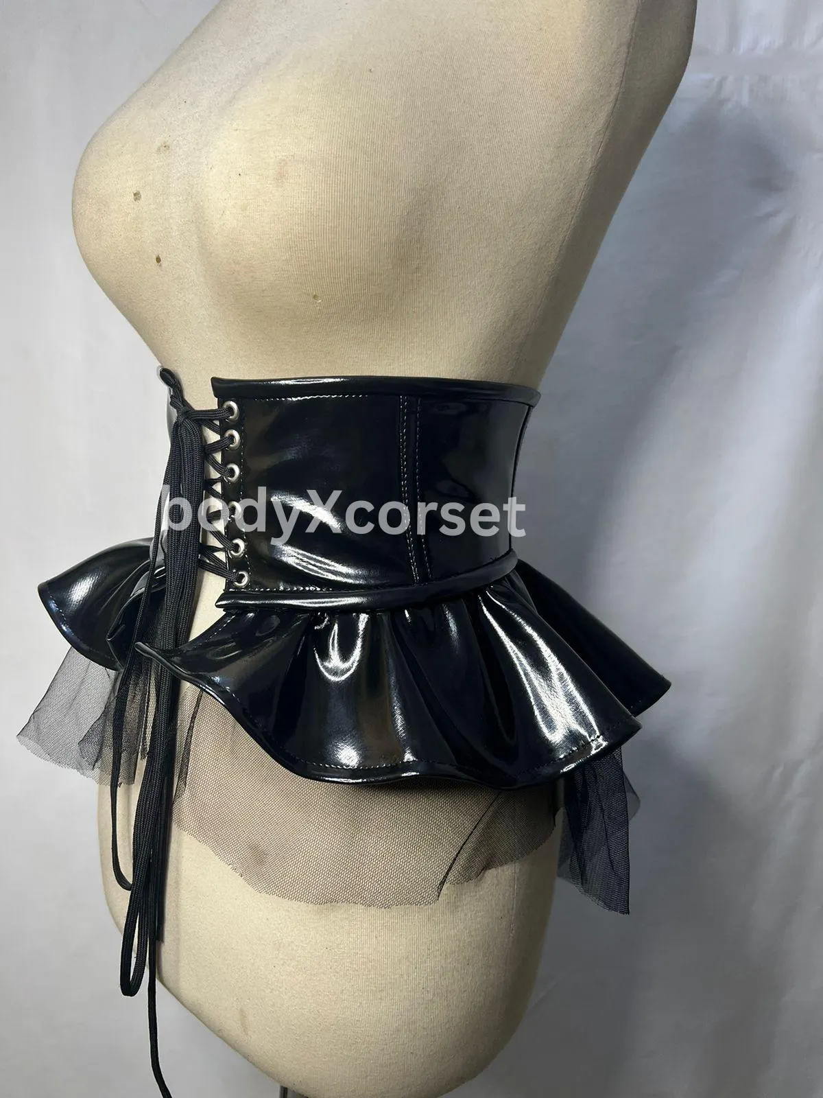 Black Faux Leather Corset Belt with Peplum Ruflle Skirt Black Cupless Waist Belt Burlesque Lingerie Accessory Fetish Cosplay Corset Skirt