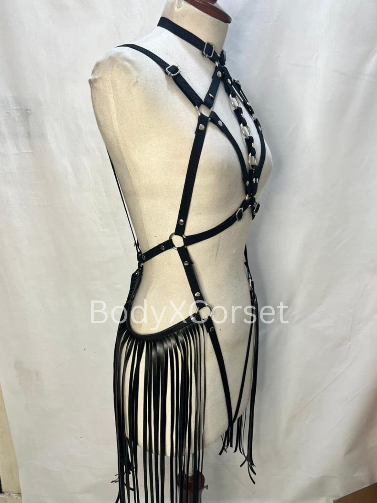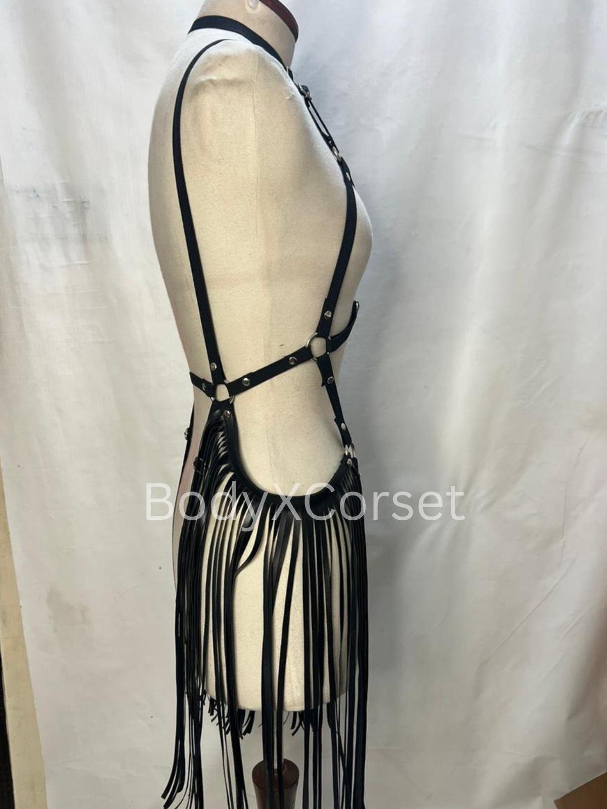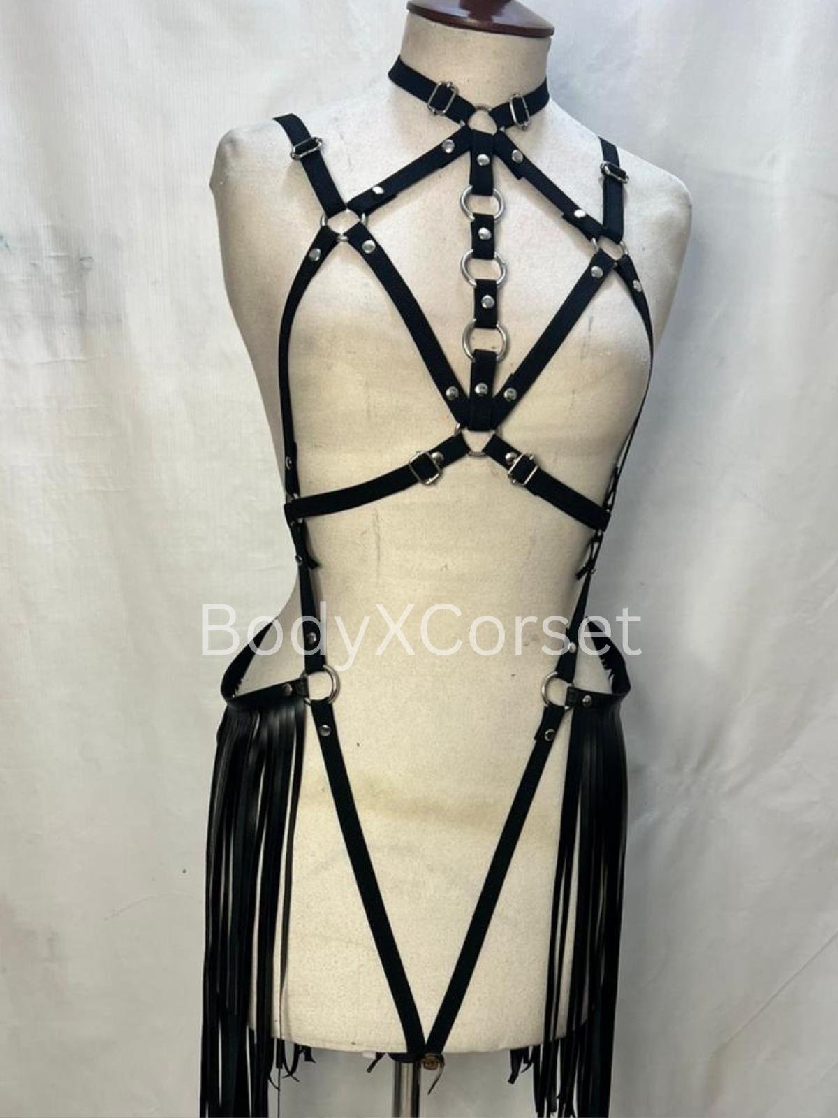 Black Faux Leather Fringe Harness: Adjustable Rave Body Cage Gothic BDSM Lingerie Costume Dancewear