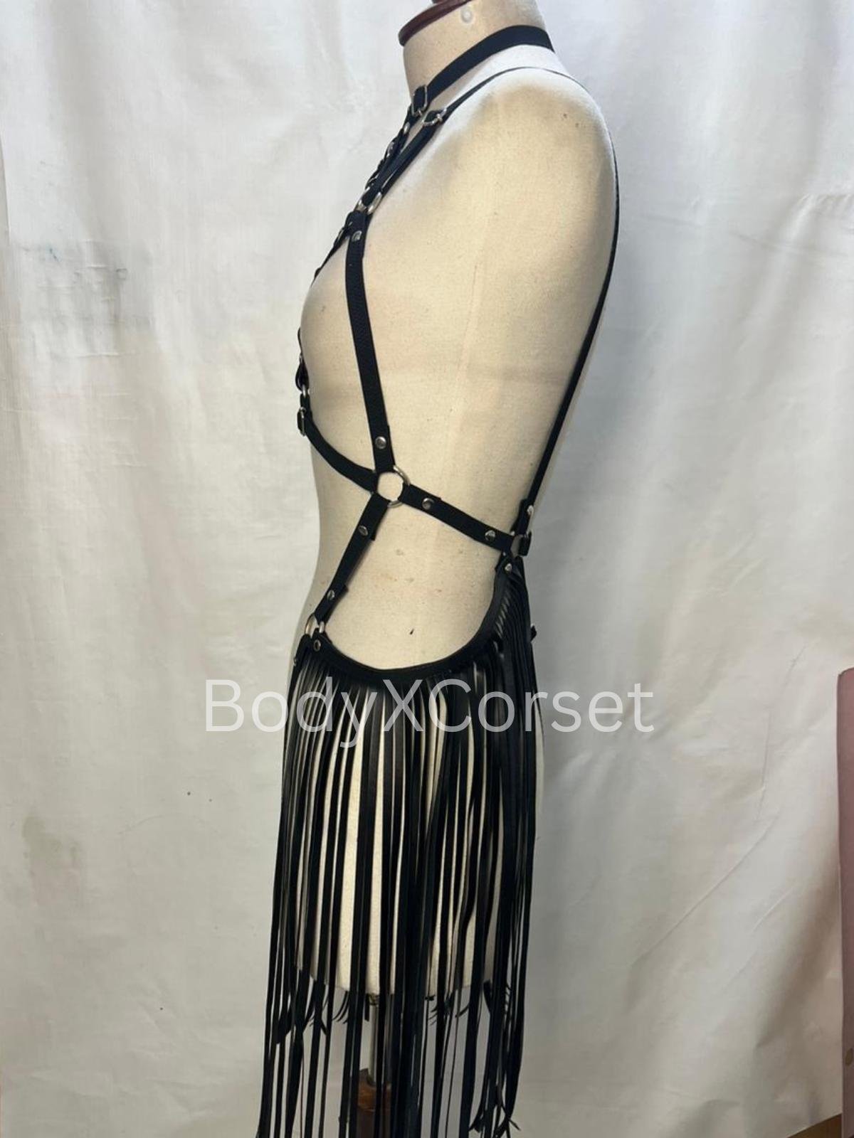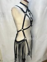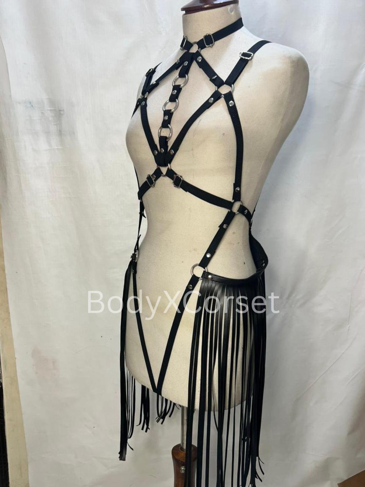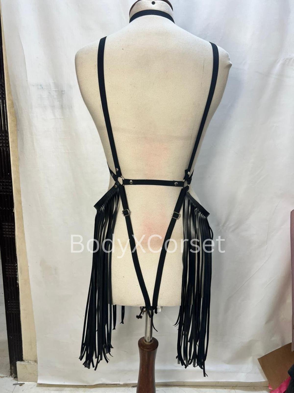 Black Faux Leather Fringe Harness: Adjustable Rave Body Cage Gothic BDSM Lingerie Costume Dancewear