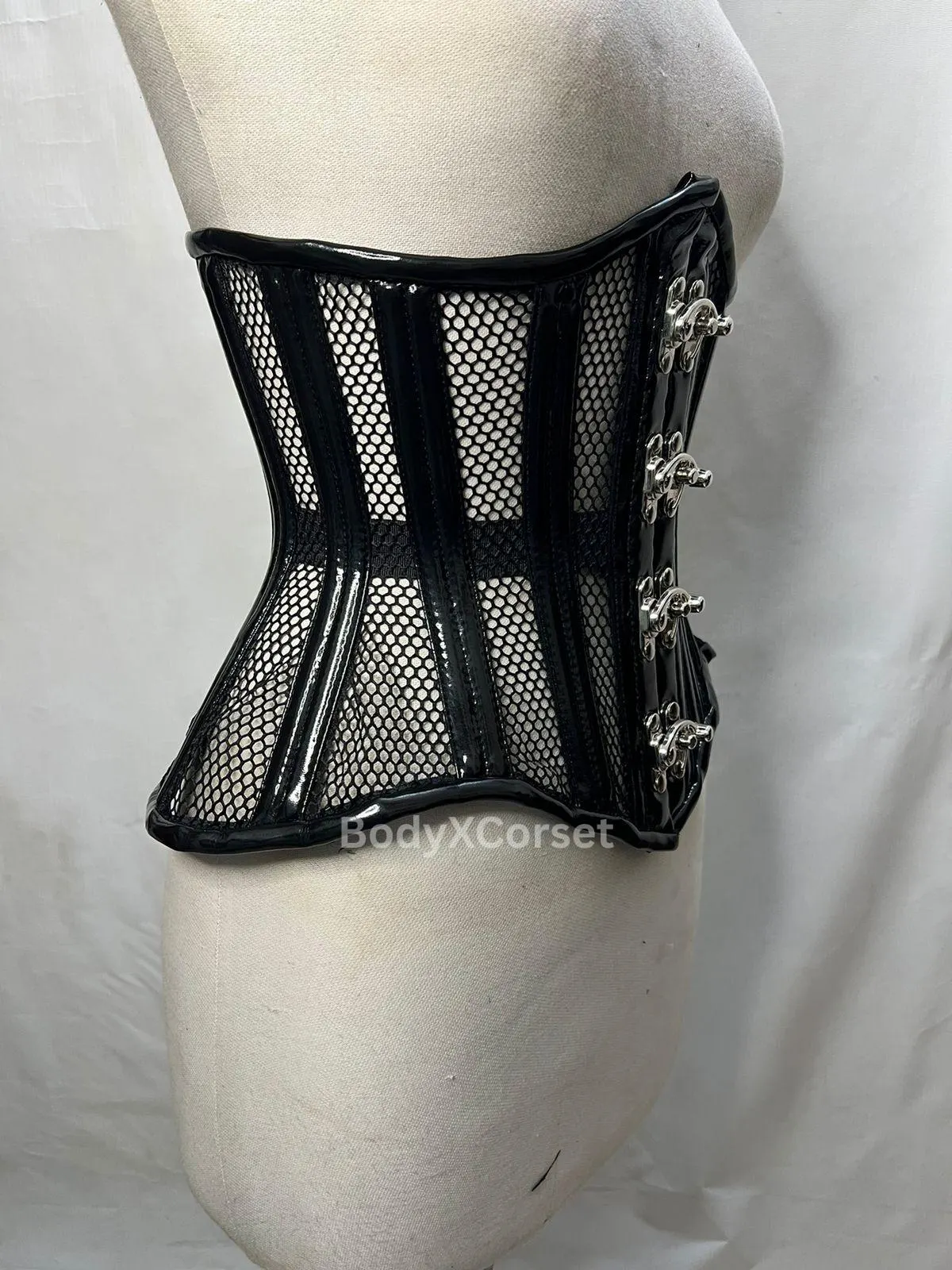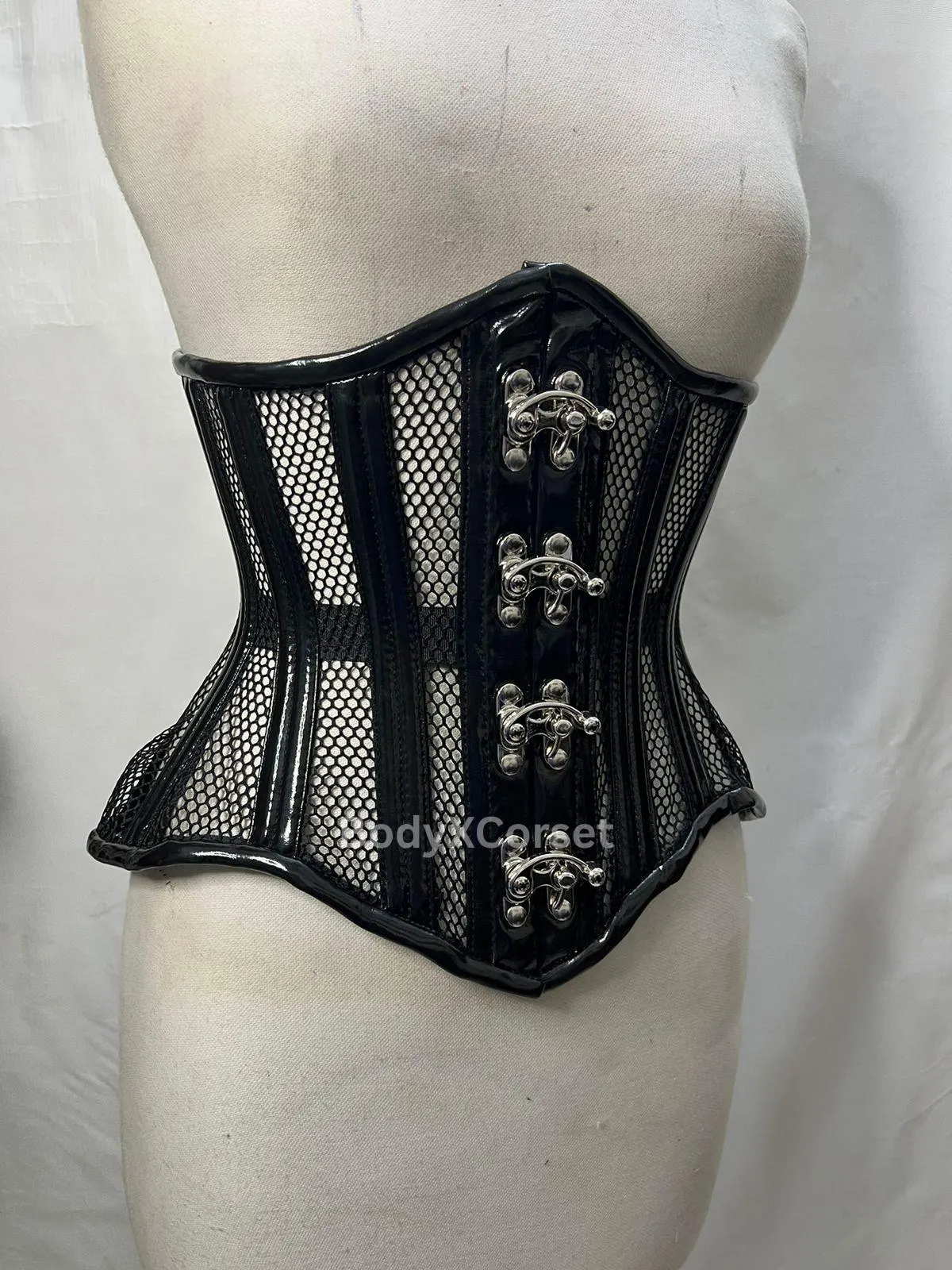 Crafted with premium black mesh panels and glossy PVC accents, this steel-boned corset delivers a dramatic hourglass silhouette while allowing airflow for maximum wearability. The sturdy front busk closure with intricate silver swing clasps adds a luxe, vintage touch inspired by steampunk, fetish fashion, and burlesque aesthetics.