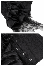 Turn heads instantly with this black gothic overbust corset for women, designed to deliver bold elegance with dramatic flair. Featuring a striking asymmetrical ruffle design and delicate lace detailing, this statement corset top blends edgy fashion with modern high-style aesthetics.