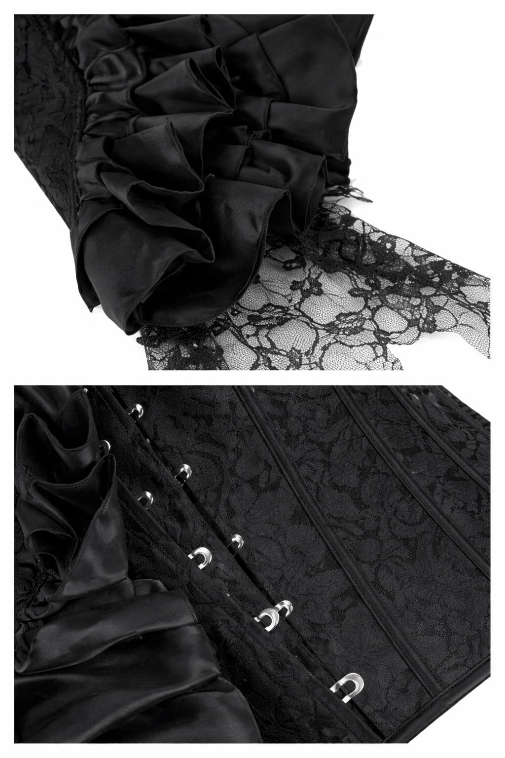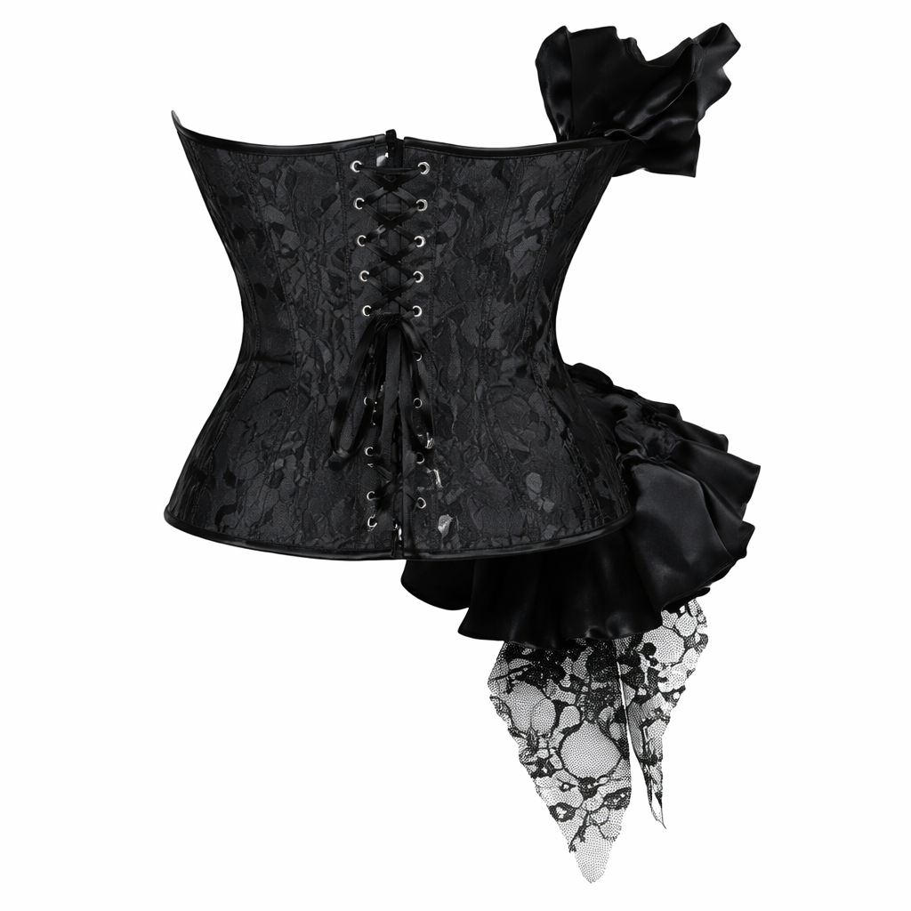 - Design: Black Floral Jacquard Corset with Dramatic Asymmetrical Ruffle & Lace Detail