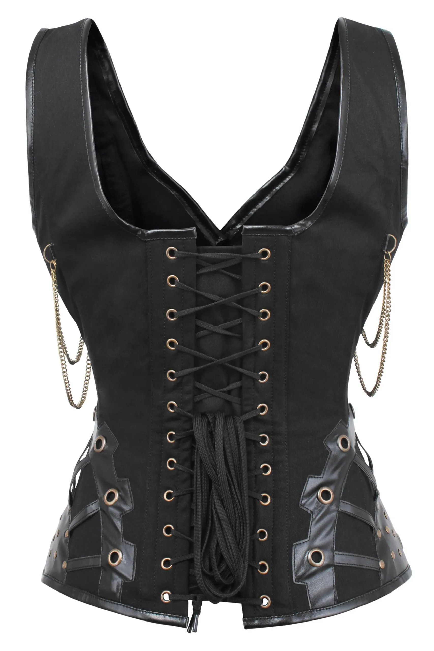 The black color scheme, accented with leatherette and metallic chains, embodies the dark glamour of gothic fashion and the industrial edge of steampunk. The appliqué with eyelets and press-studs adds intricate detailing, making this corset a statement piece for both fashion and performance settings.