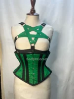 The pentagram harness bra features adjustable elastic straps with an eye-catching emerald green pentacle design across the chest. Paired with a beautifully sculpted underbust corset in matching green and black tones, this outfit is ideal for waist training, stage performance, or making a bold fashion statement at your next event.