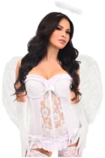 - Complete Set: Includes bustier, white satin gloves, white feather halo, and white feather angel wings.