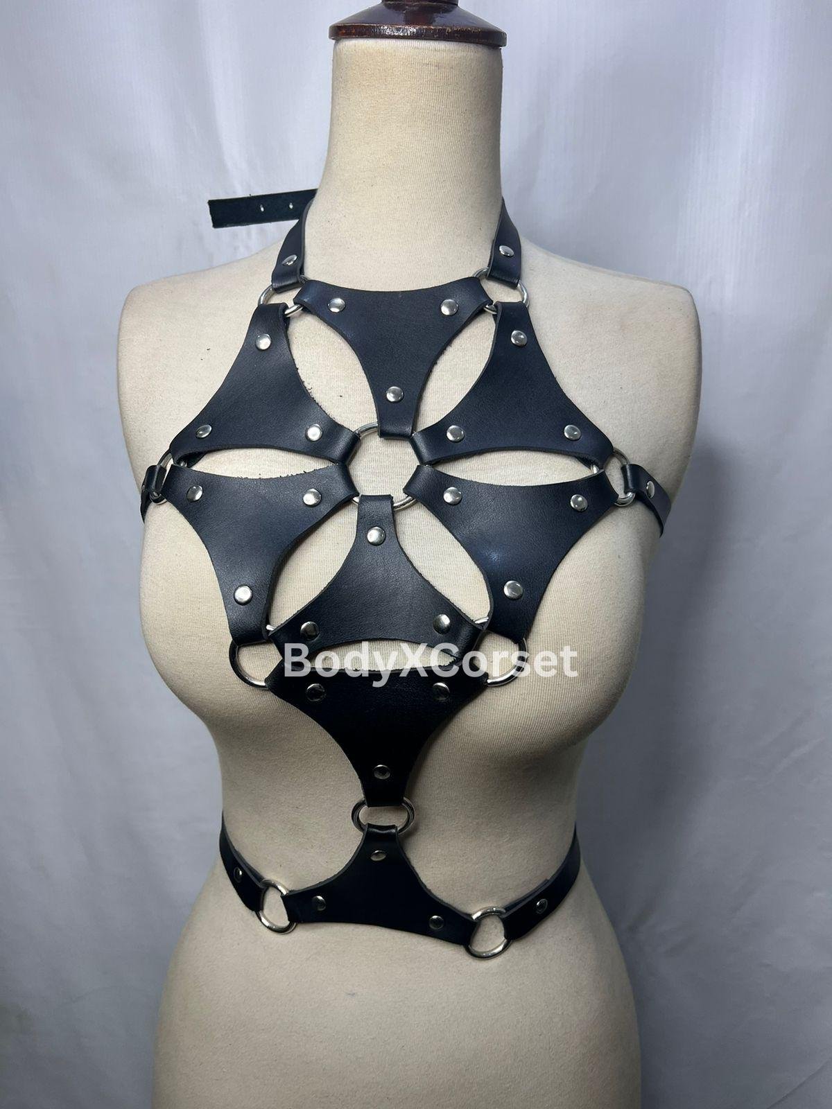 Elevate your alternative fashion game and express your fierce individuality with this handmade black leather body harness. Add it to your cart now and dominate any scene—on stage, at a festival, or in the bedroom.