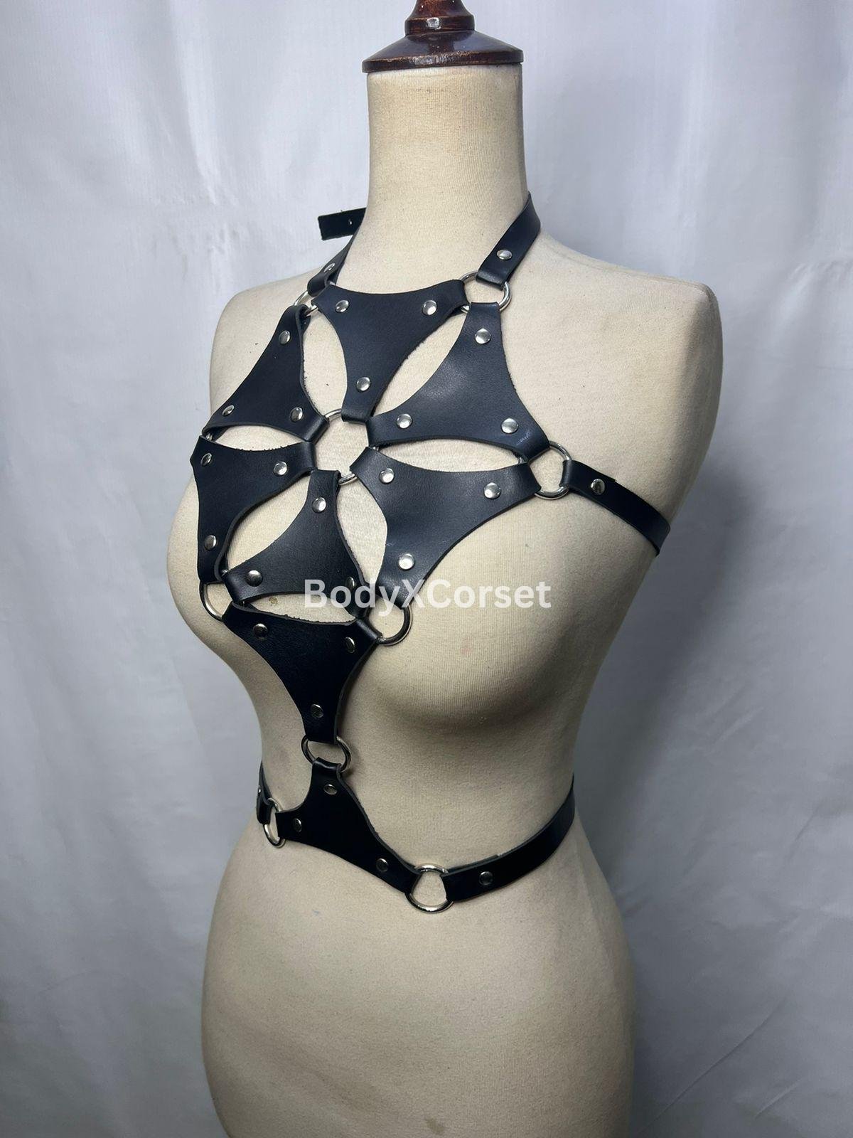 Black Leather Body Harness for Women – Adjustable Gothic Festival Harness Top – Punk Rave Bondage Harness Lingerie – BDSM Fetish Outfit Cage Bra