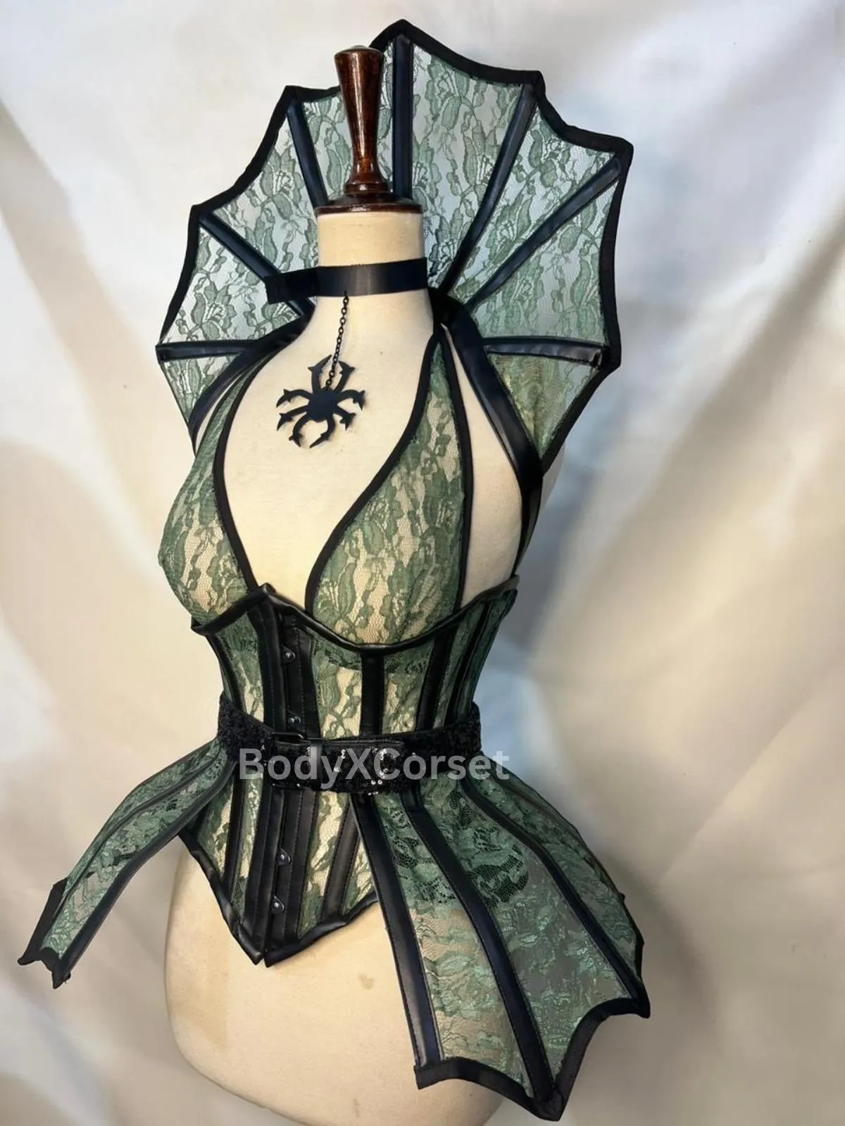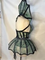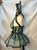 This corset is crafted from a delicate green floral lace overlay, reinforced with sleek black satin and sturdy steel boning for a flawless silhouette and superior support. The most striking feature is the fan-shaped high collar and structured peplum skirt, both accented with lace panels edged in black faux leather, creating a mesmerizing spider web effect. Complete with a detachable black spider pendant choker, this corset captures the essence of gothic glamour.