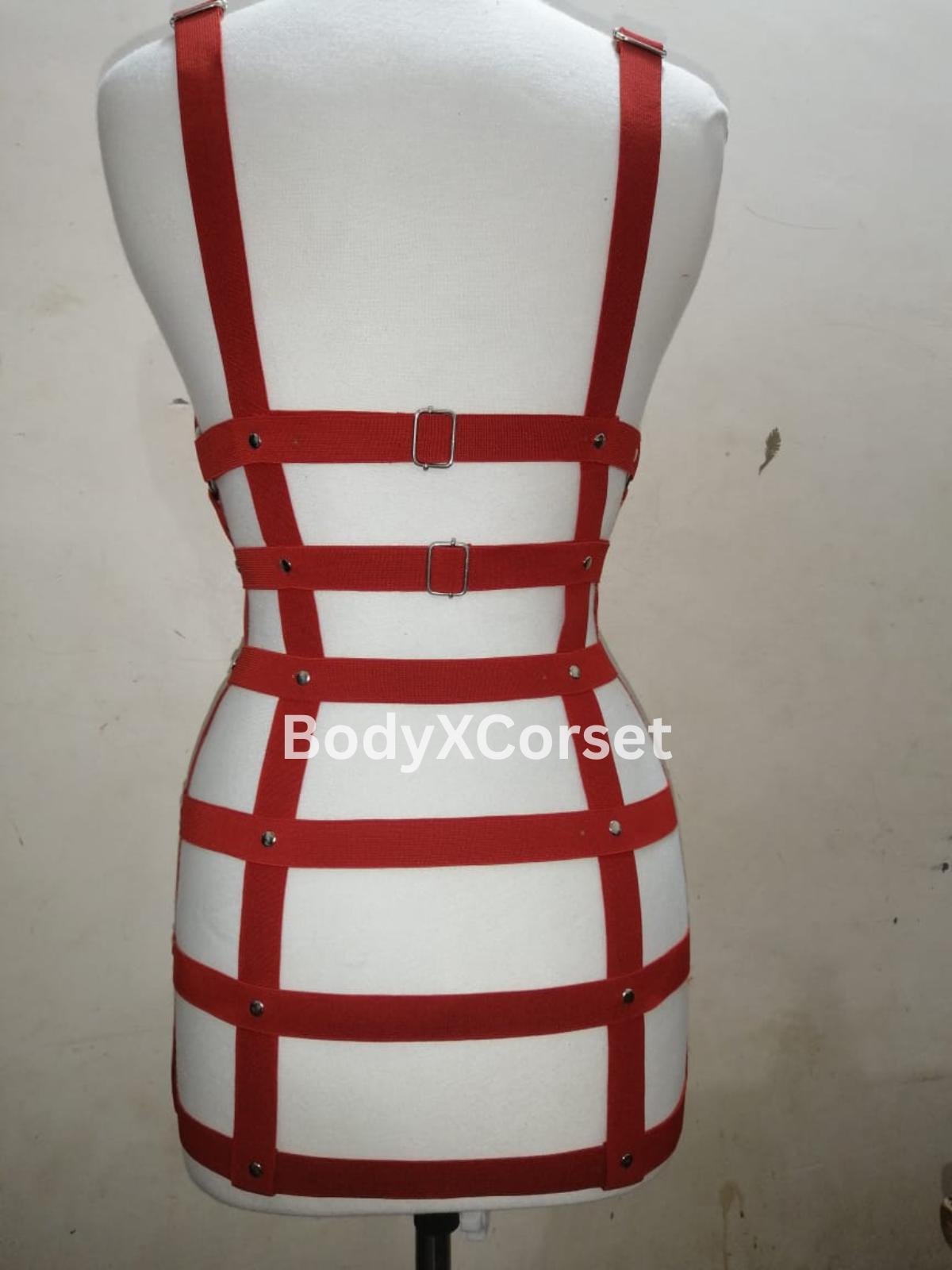 Turn up the heat and feel empowered in this bold handmade red body harness lingerie. Designed to make a statement, this adjustable strappy cage harness hugs your curves perfectly and adds an edgy, daring vibe to any outfit — or nothing at all!