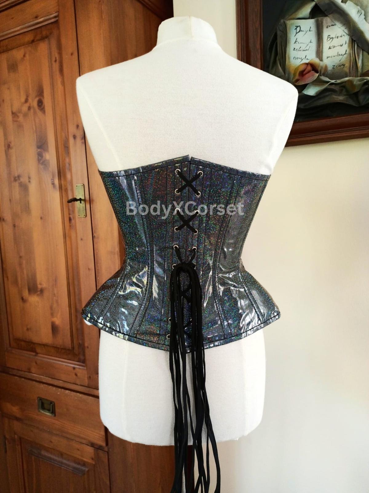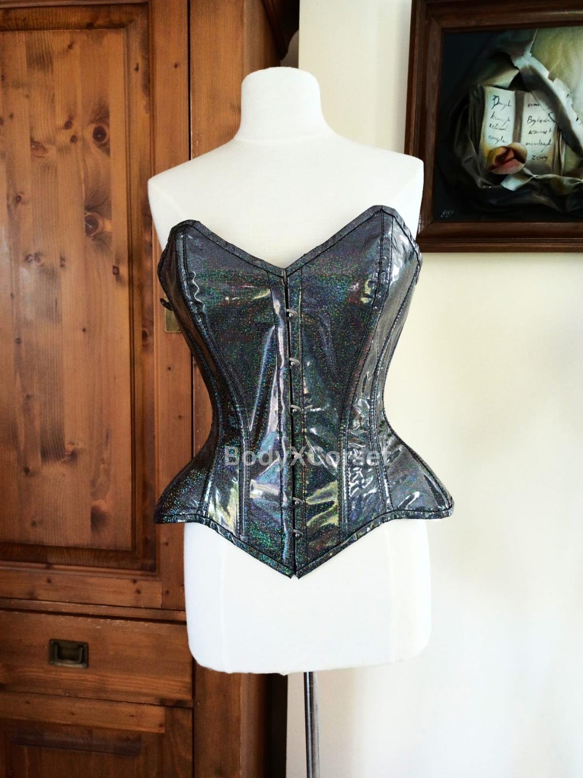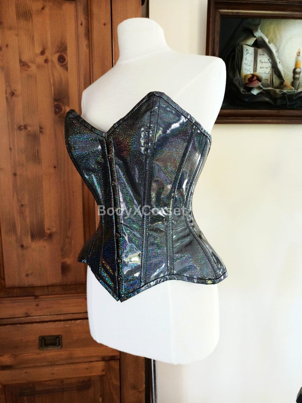 Holographic steel boned corset top with a shiny, iridescent finish.