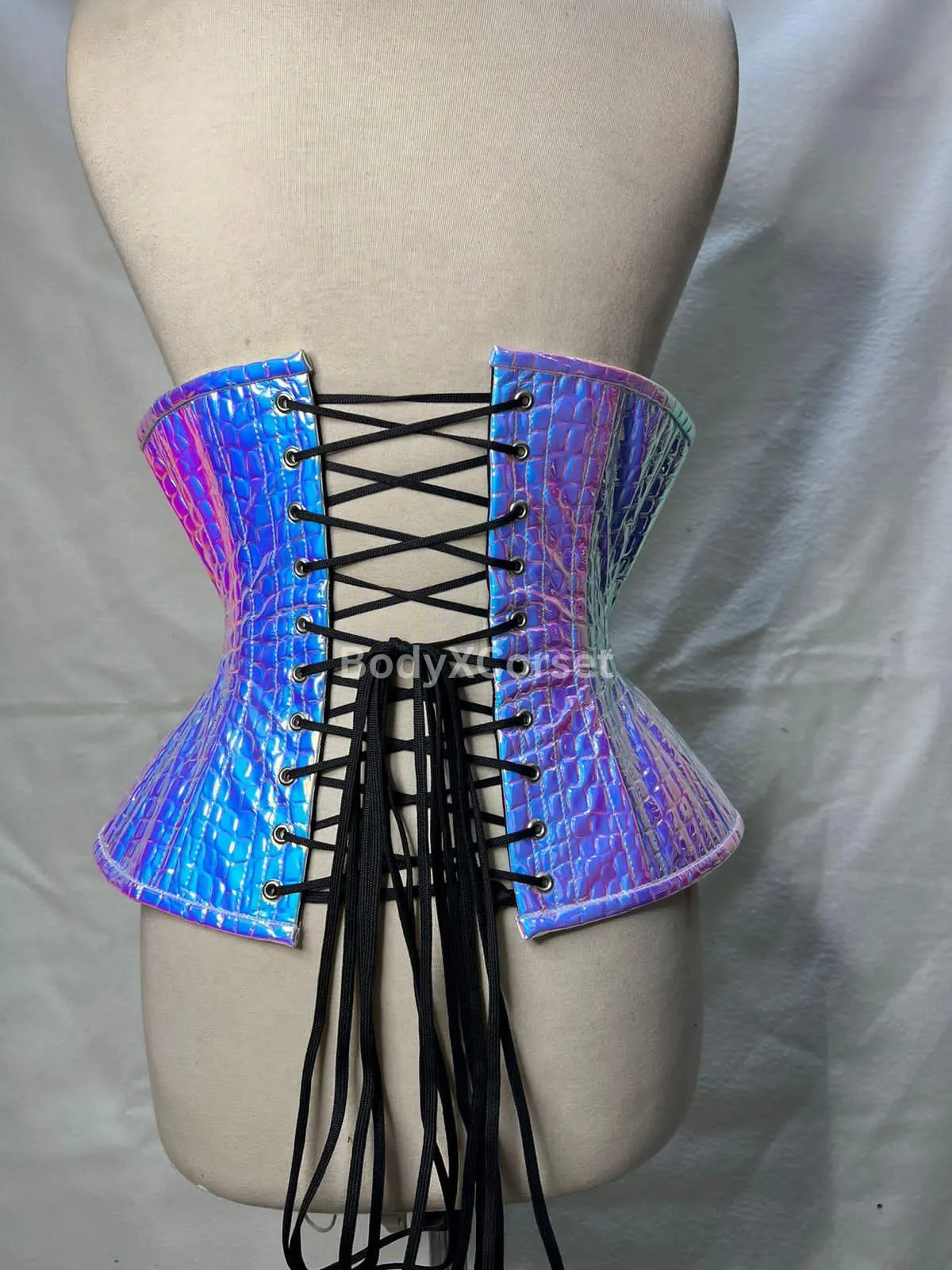 Holographic Crocodile Corset: Iridescent Steel Boned Waist Cincher, Goth Cyberpunk