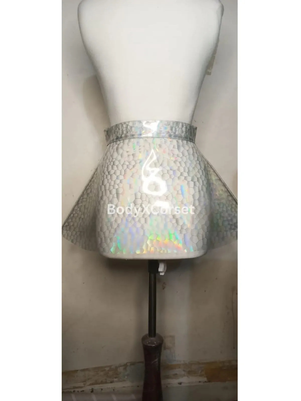 Crafted from durable, glossy PVC vinyl, this skirt features a textured hexagonal holographic pattern that mimics the effect of dragon scales or metallic honeycomb. The structured silhouette holds its shape perfectly, giving you that dramatic flared skater look. The waistband is reinforced with matching iridescent trim for extra durability and support, creating a snug, flattering fit at the natural waist.