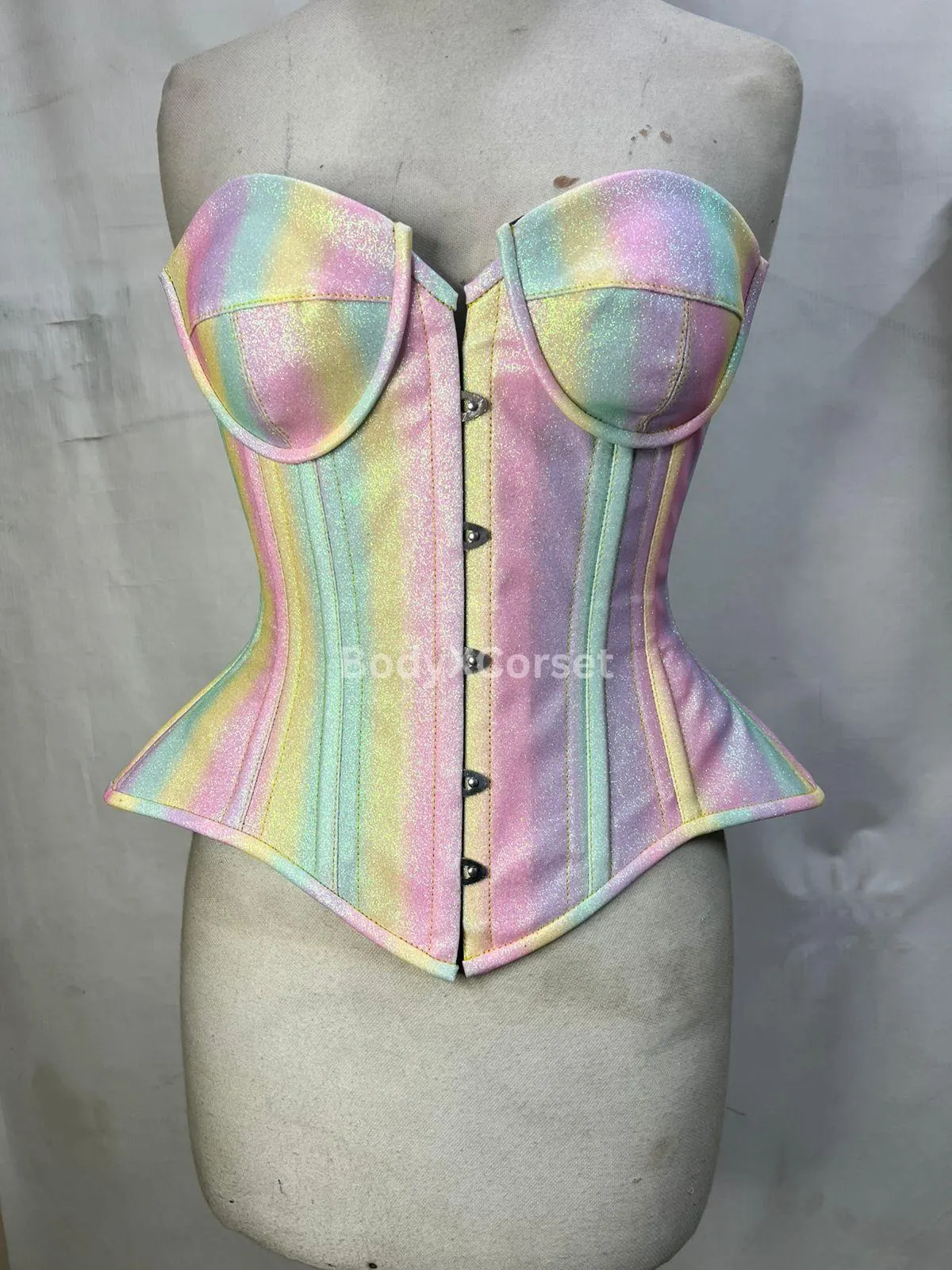 Crafted from high-quality holographic fabric in pastel rainbow hues — including pink, mint green, baby blue, lavender, and golden yellow — this corset glistens under the light with a shimmering, glitter-infused finish. It’s a magical, mermaid-like sheen that photographs beautifully and radiates confidence.