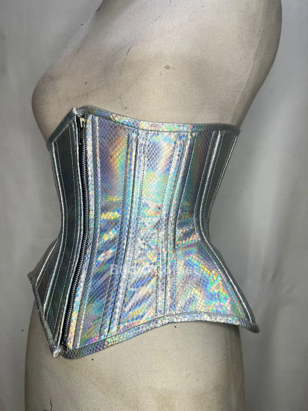 Turn heads and steal the spotlight with this stunning Holographic Snake Skin Corset, a bold and edgy waist cincher designed to elevate your fashion game. Featuring a shimmering iridescent finish that reflects the light in a full spectrum of rainbow hues, this overbust corset is the perfect statement piece for any fashion-forward wardrobe.