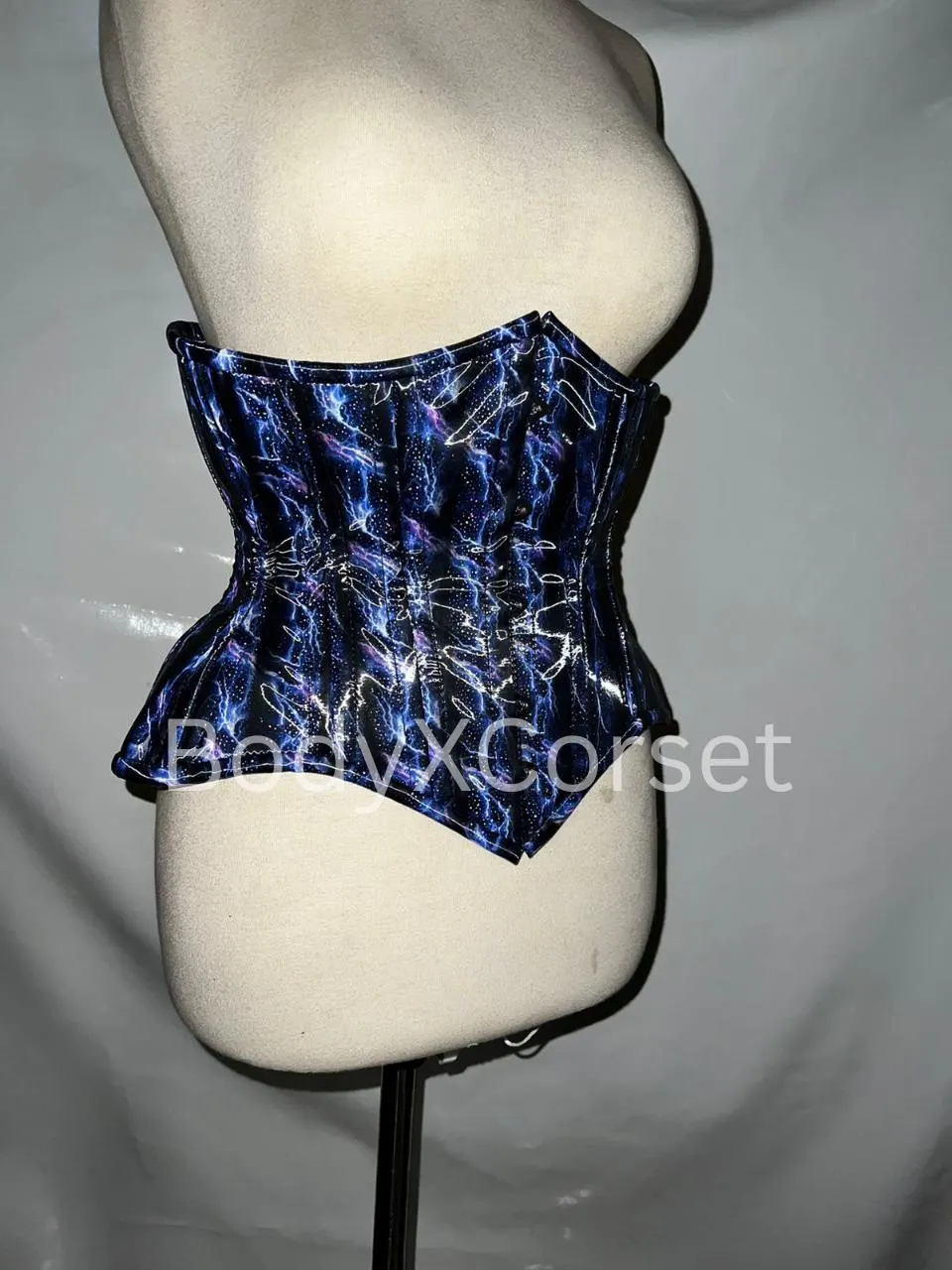 Its holographic shimmer, steel boning, and adjustable lacing make it both functional and stylish.