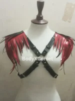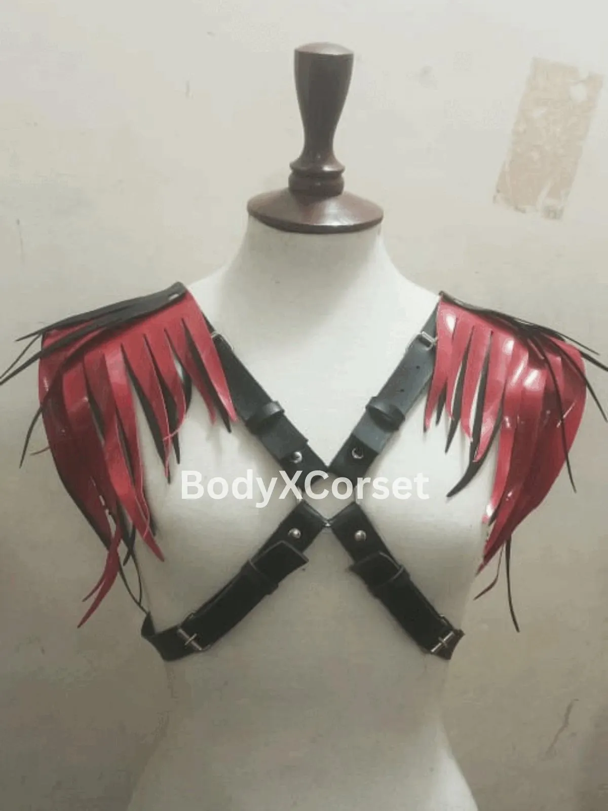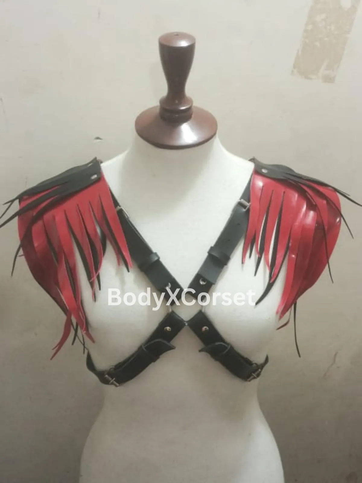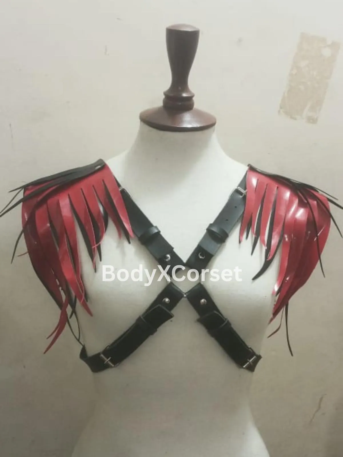 Handmade with passion and precision, this shoulder harness features striking red and black fringe leather details, layered to resemble wings or flames, giving your shoulders a wild, fiery flair. The straps cross over the chest in a powerful “X” formation and are finished with adjustable buckles for a perfect, secure fit across different body types.