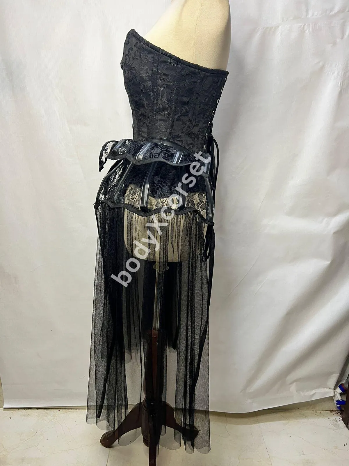 What truly sets this corset apart is the unique pannier-inspired hip accents, structured with faux leather piping and layered with black lace and soft tulle streamers that cascade dramatically down each side. These tulle drapes add graceful movement and gothic drama to every step, mimicking a bustle skirt but with a lighter, more ethereal look. The result is a gothic corset dress that’s both hauntingly beautiful and structurally bold.