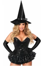 - 3-Piece Glamorous Set: Sequin sweetheart corset dress, witch hat, black gloves.