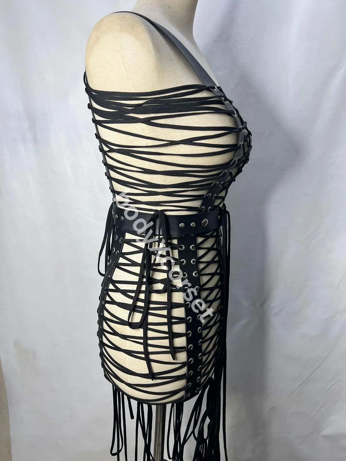 The wide leather shoulder straps provide comfortable support while keeping the harness securely in place. At the waist, a structured leather belt with stud embellishments accentuates your curves, giving you a cinched hourglass shape. Long dangling laces and fringe add dramatic movement to your look, creating an unforgettable visual impact with every step.