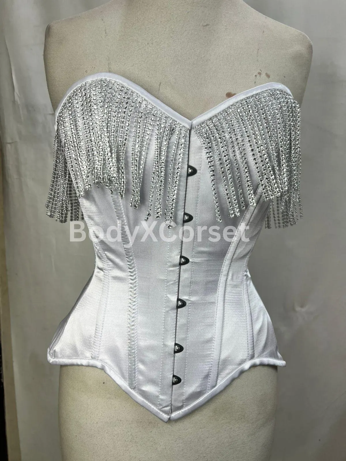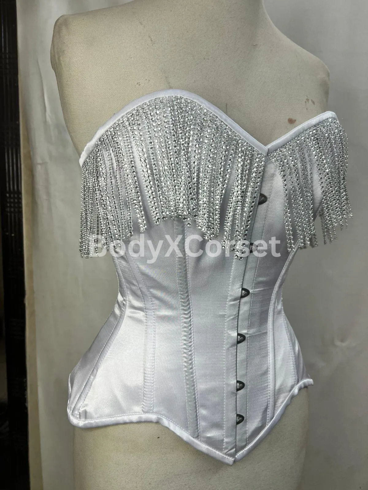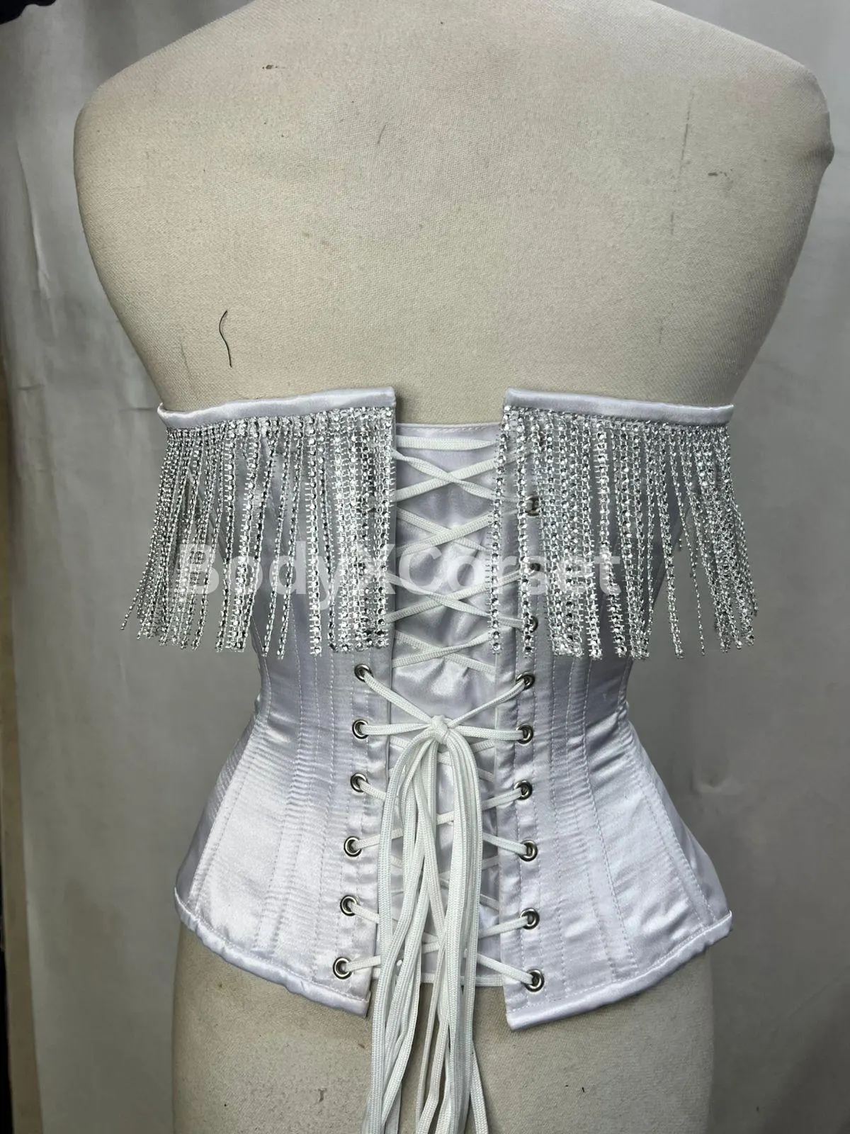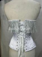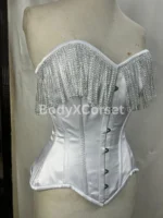🌙 Order your custom white satin fringe corset today and shine with timeless elegance and confidence!