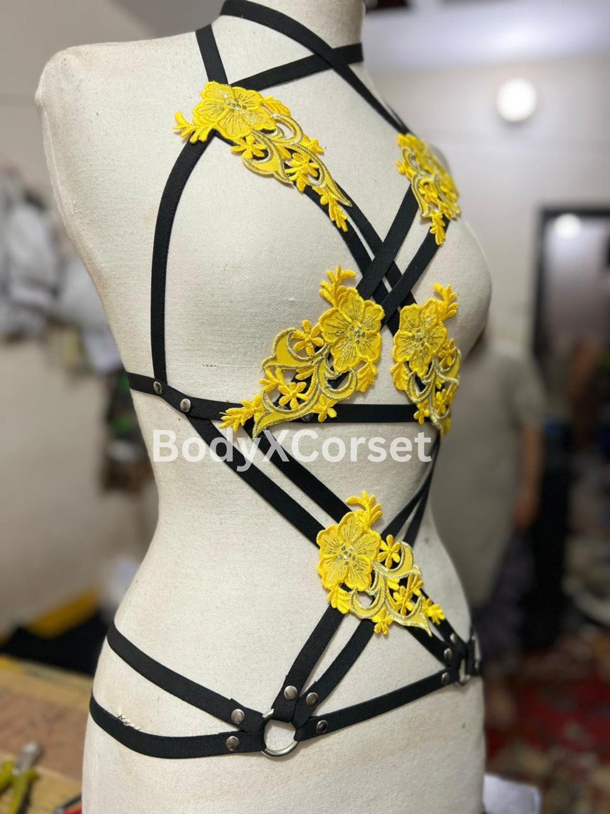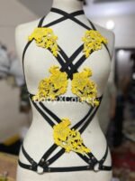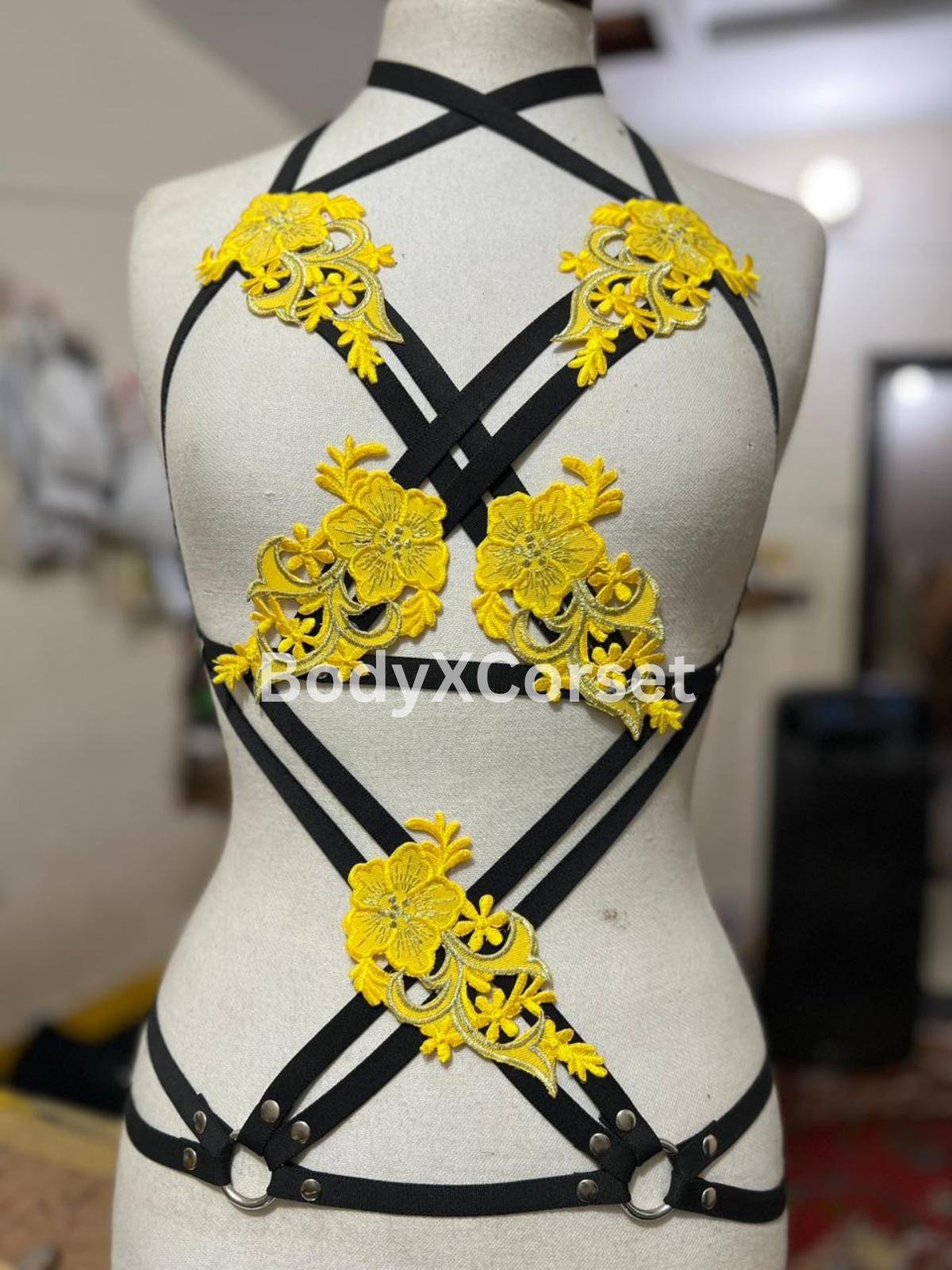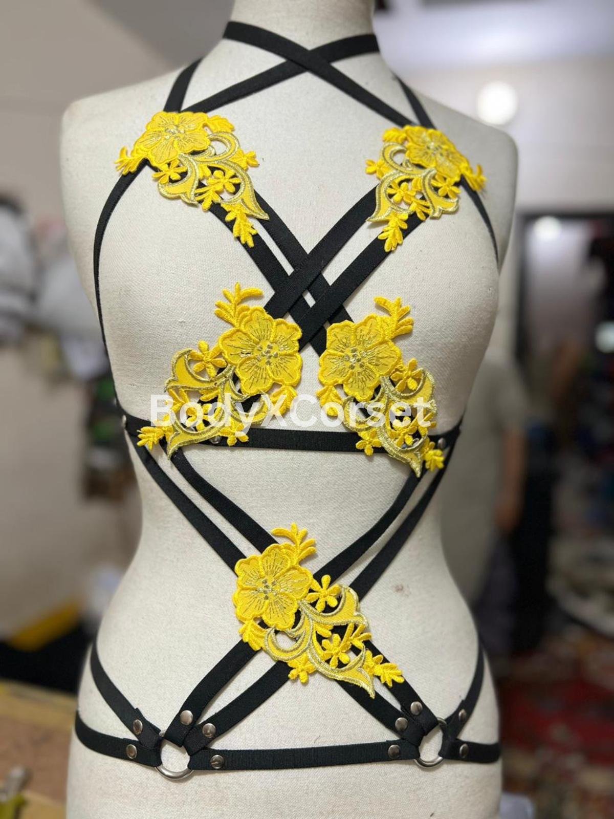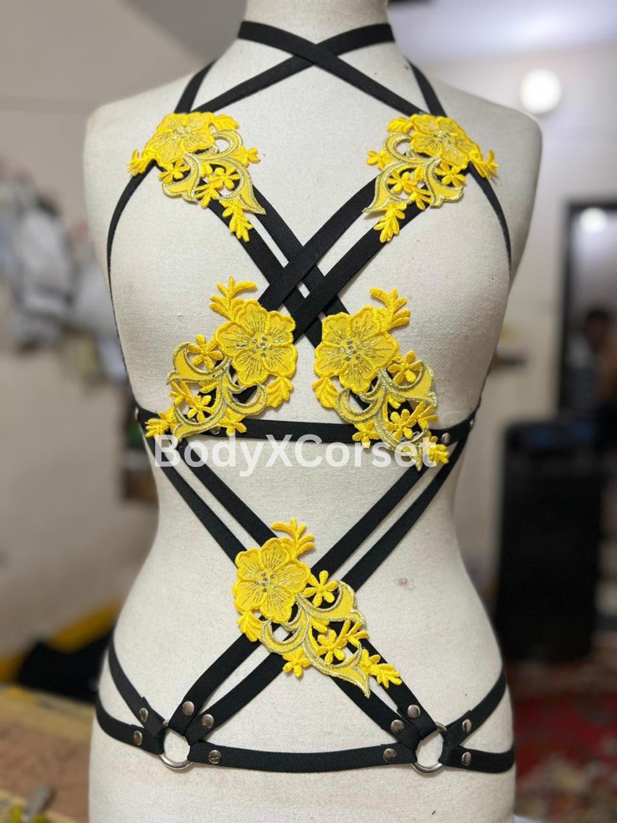 Turn heads and express your bold, confident style with this stunning Yellow Floral Body Harness. Featuring bright embroidered applique flowers and a flattering black strappy cage design, this handmade harness top is perfect for festival fashion, rave outfits, or seductive boudoir lingerie.