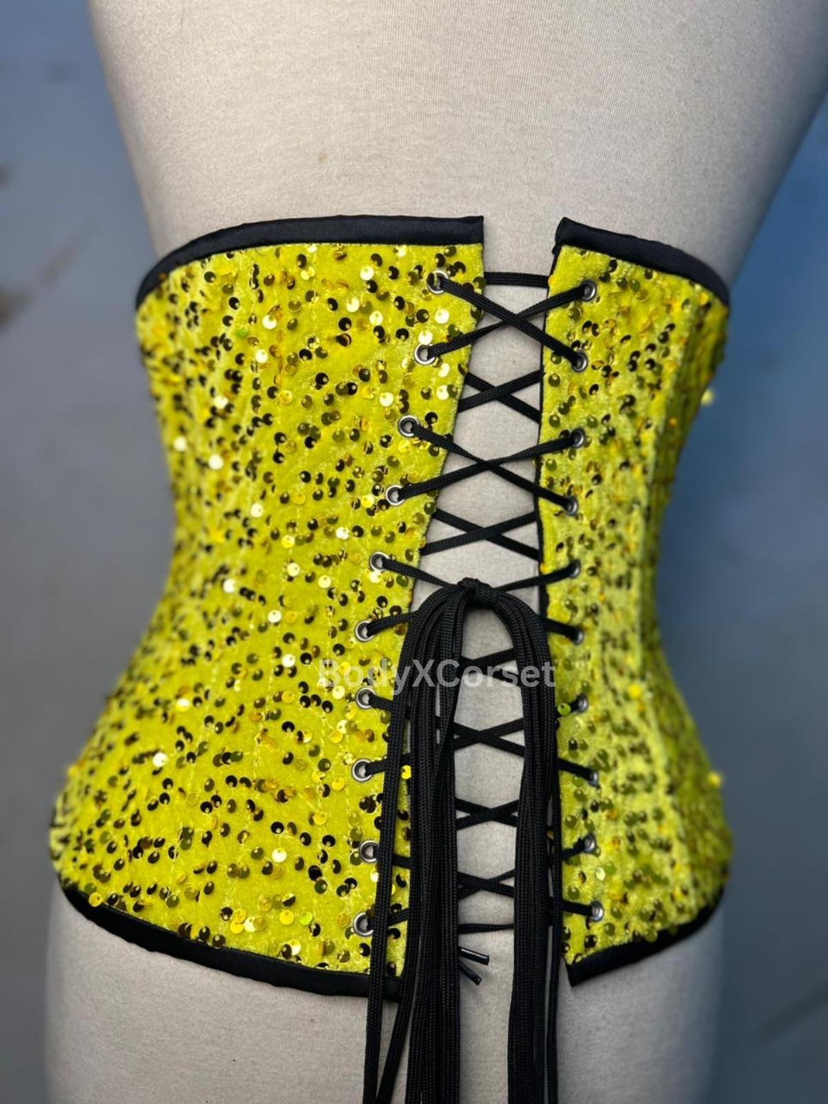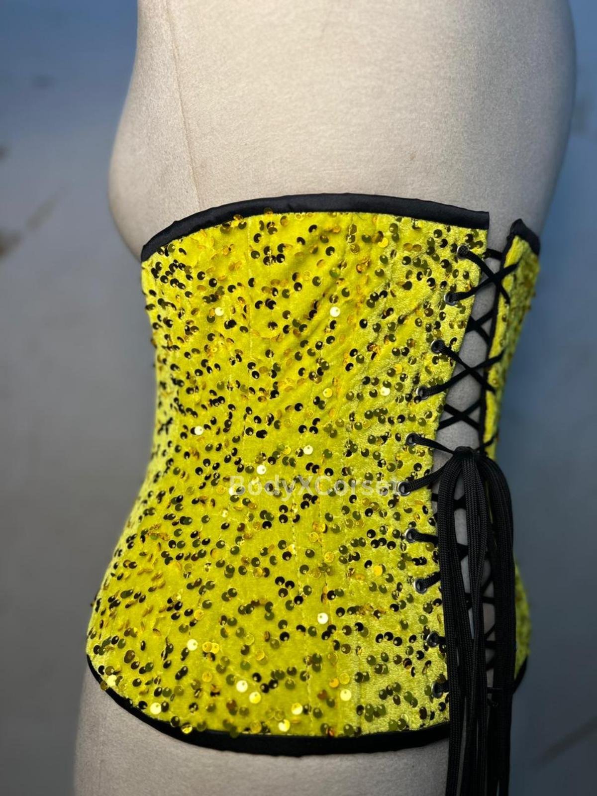 corset top, steel boned corset, sequin corset, waist trainer corset, burlesque costume, rave outfit, gothic corset, cosplay corset, drag queen outfit, overbust corset, yellow party wear corset, waist cincher, hourglass corset for women, sparkly corset